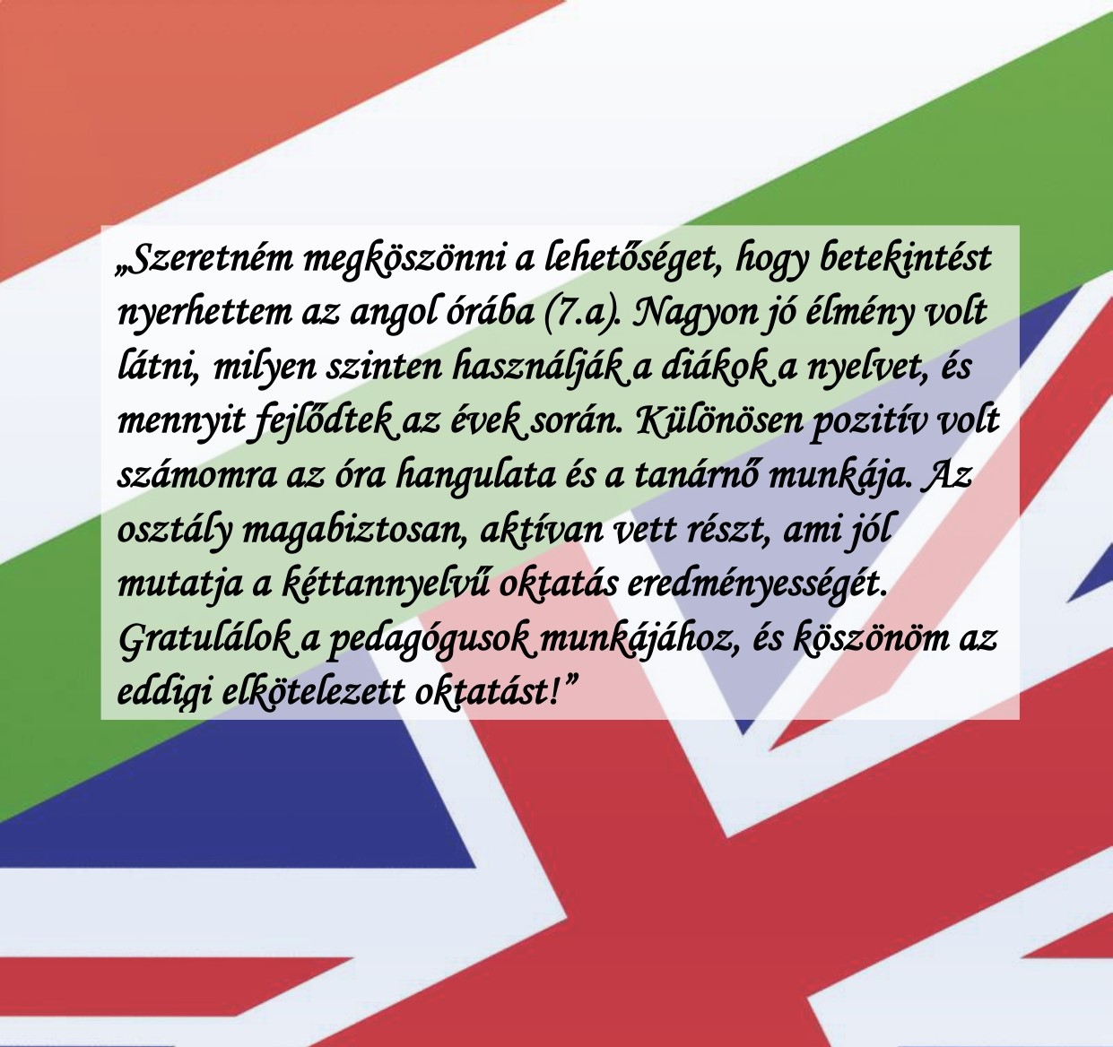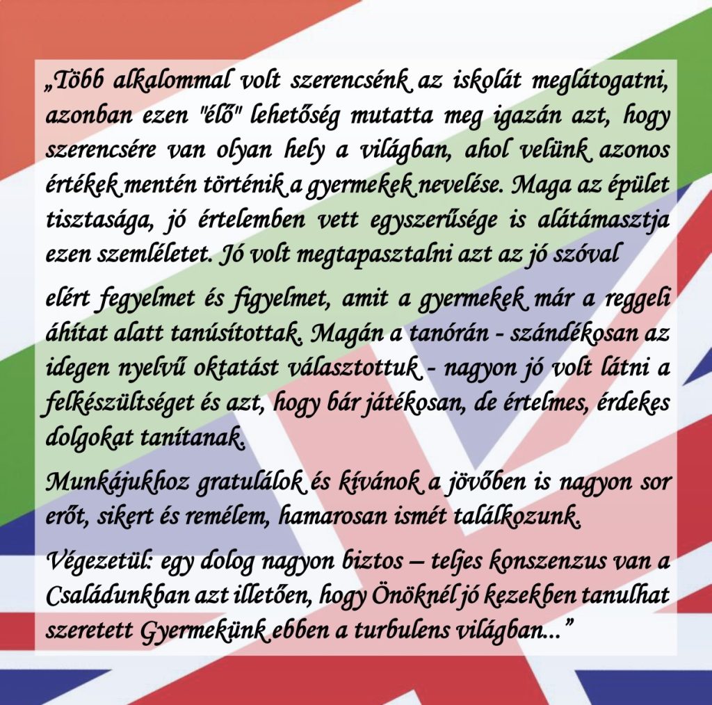 Az intézmény dolgozói igyekeztek olyan utat mutatni, ami az örök keresztény értékrend mentén halad. Külön felhívta a figyelmet a gyerekek számára a szülők és családtagjaik iránti köszönet és hála fontosságára, majd intézményvezetőként külön kiemelve megköszönte Horváth Zsuzsanna és Belsőné Baranyi Gizella osztályfőnököknek odafigyelő munkájukat.