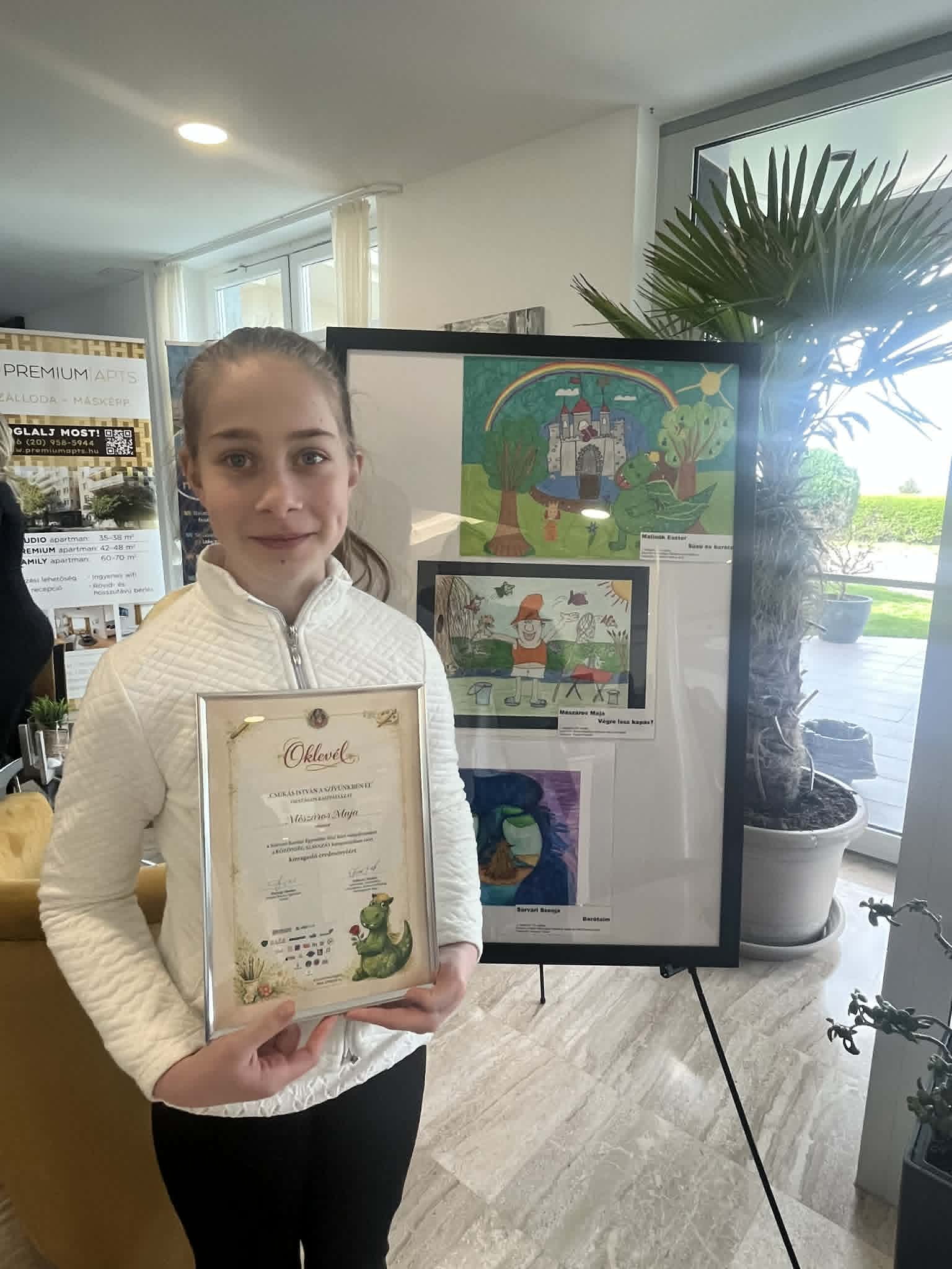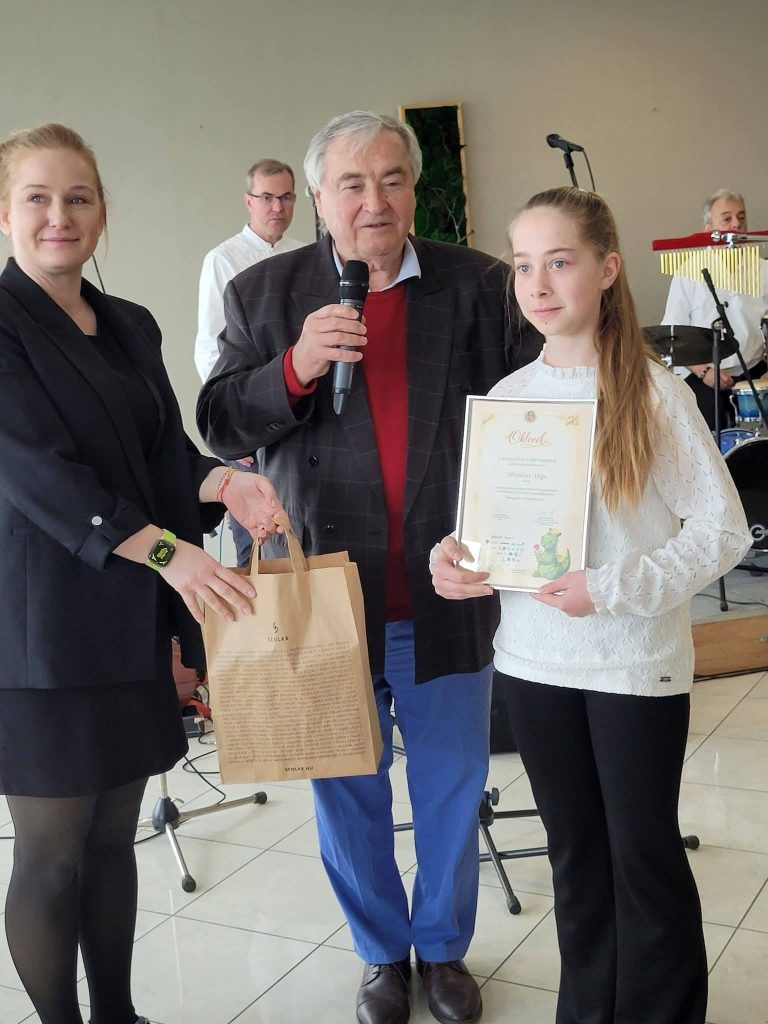 Nagy örömünkre Mészáros Maja, iskolánk 5. b osztályos tanulója a pályázaton több mint 600 szavazattal I. helyezést ért el. Az ünnepélyes díjkiosztóra 2026. április 4-én került sor Balatonszárszón, ahol Maja átvehette a munkájáért járó elismerést.