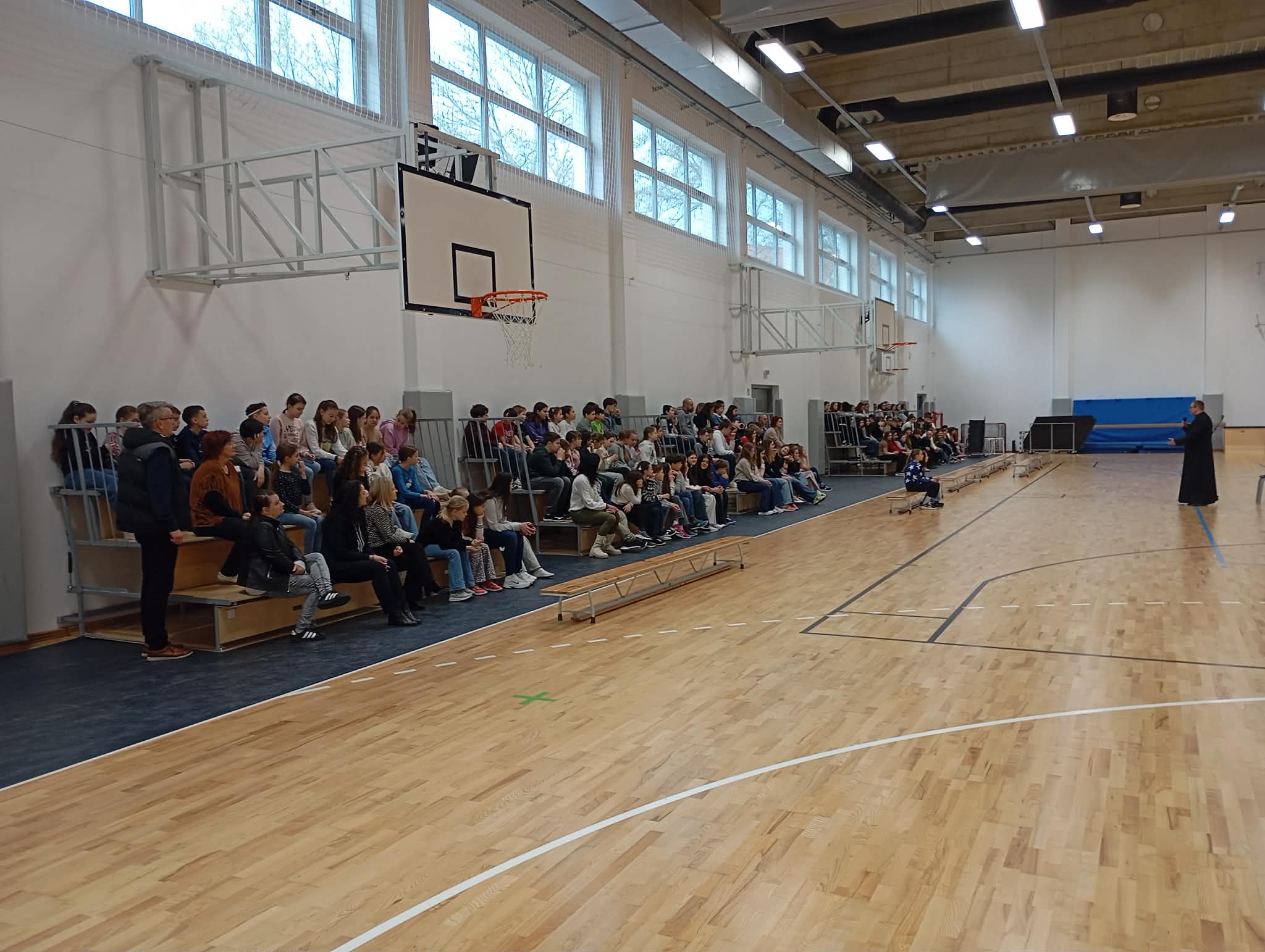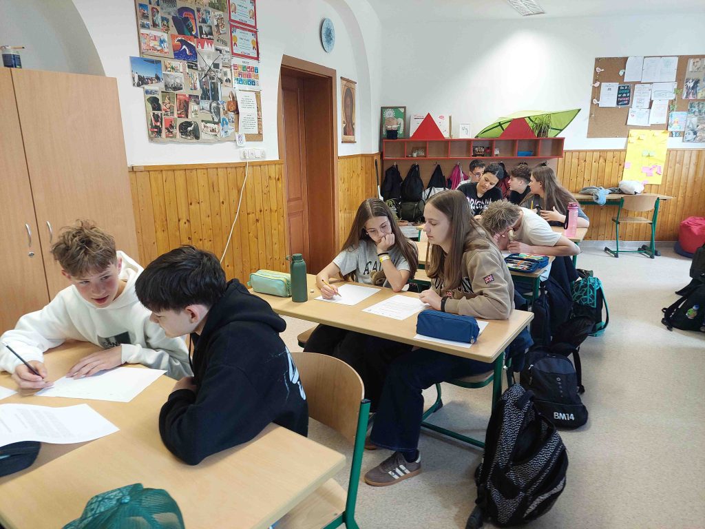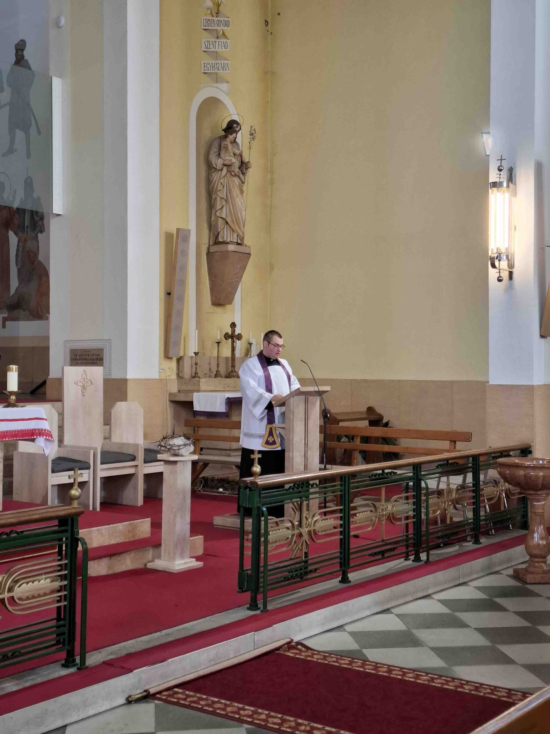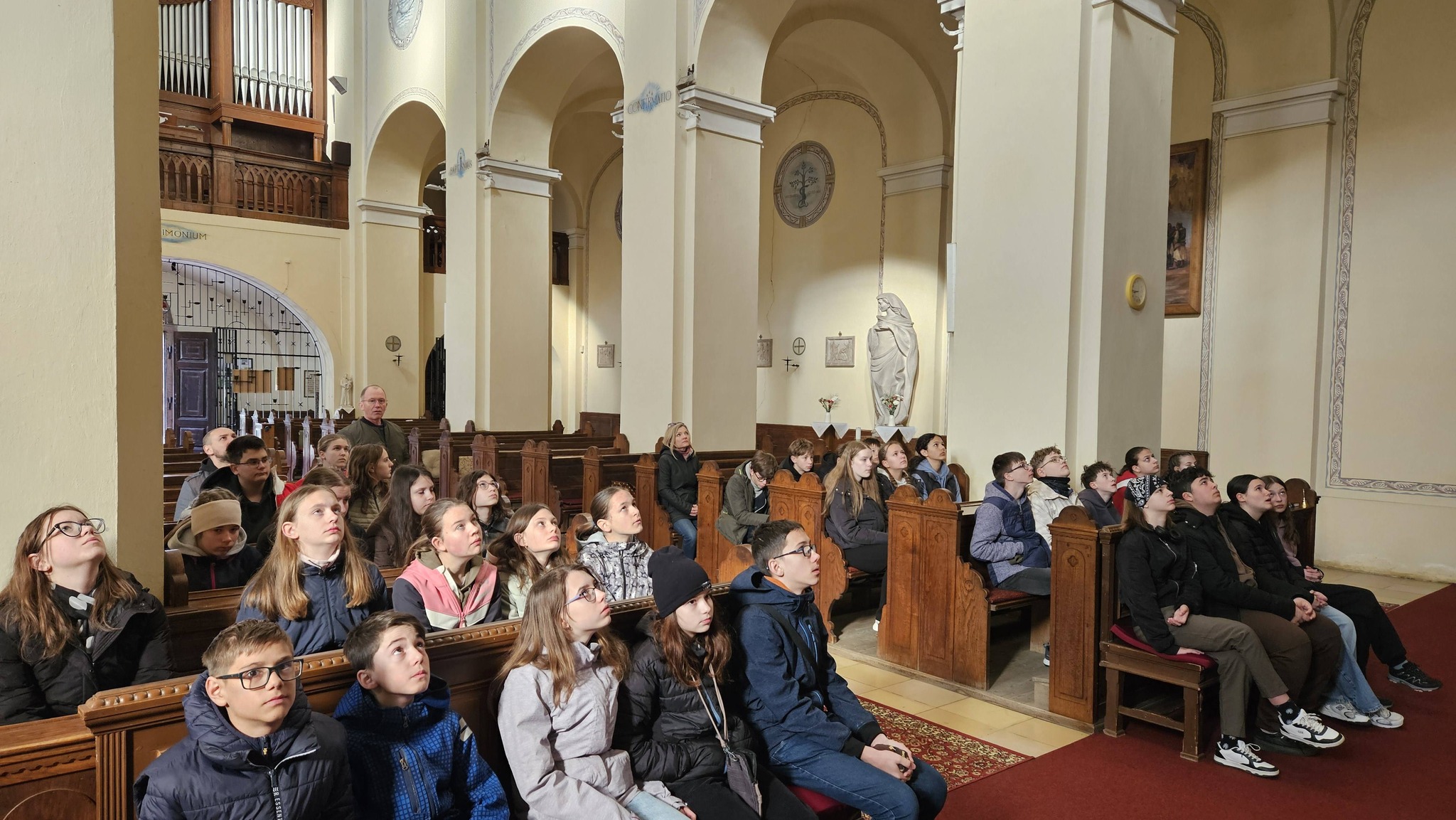 A felső évfolyamosok, Kovács Gábor, tatai plébános atyával Assisi Szent Ferenc és Szent Benedek életéről elmélkedtek a tornacsarnokban, majd a nagytemplomban keresztúti áhítaton vettek részt. Végül a bűnbánati elmélyülés után gyónási lehetőségük is volt a gyerekeknek a lelki megtisztulásra.