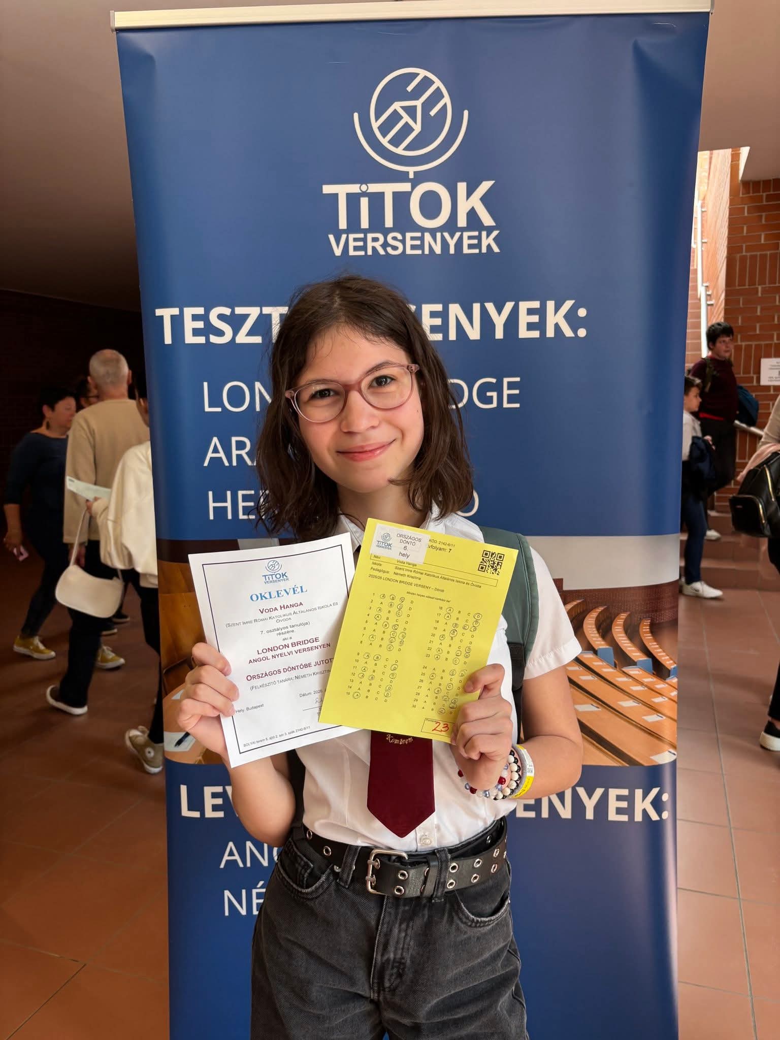 Az április 18-án megrendezett London Bridge angol nyelvi verseny országos fordulójában igen szép eredmények születtek. 6. évfolyamon Szombath Emma 6. helyezést, Czina Márton pedig 5. helyezést ért el. 7. évfolyamon Voda Hanga szintén 6. helyezett lett. Gratulálunk a remek eredményekhez!
