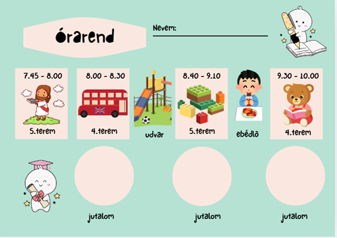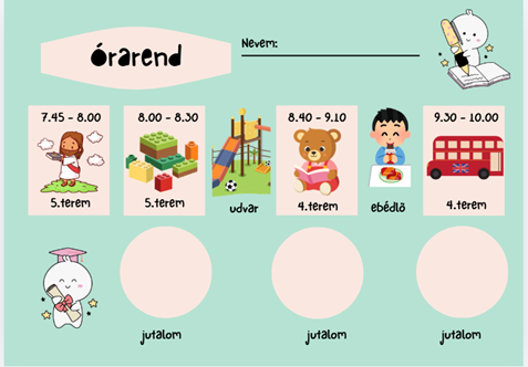 Érkezéskor minden kisgyermeket rajzos órarenddel vártunk, ezzel megkönnyítve a programok közötti eligazodást. A reggeli áhitat után két csoportra osztva matematika, angol és magyar órák követték egymást. A szünetekben birtokba vehették az udvari játékokat, illetve közös tízóraizás keretében kipróbálhatták az ebédlői rendet is.